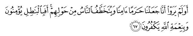 أَوَلَمْ یَرَوْا أَنَّا جَعَلْنَا حَرَمًا آمِنًا وَیُتَخَطَّفُ النَّاسُ مِنْ حَوْلِهِمْ أَفَبِالْبَاطِلِ یُؤْمِنُونَ وَبِنِعْمَةِ اللَّهِ یَکْفُرُونَ